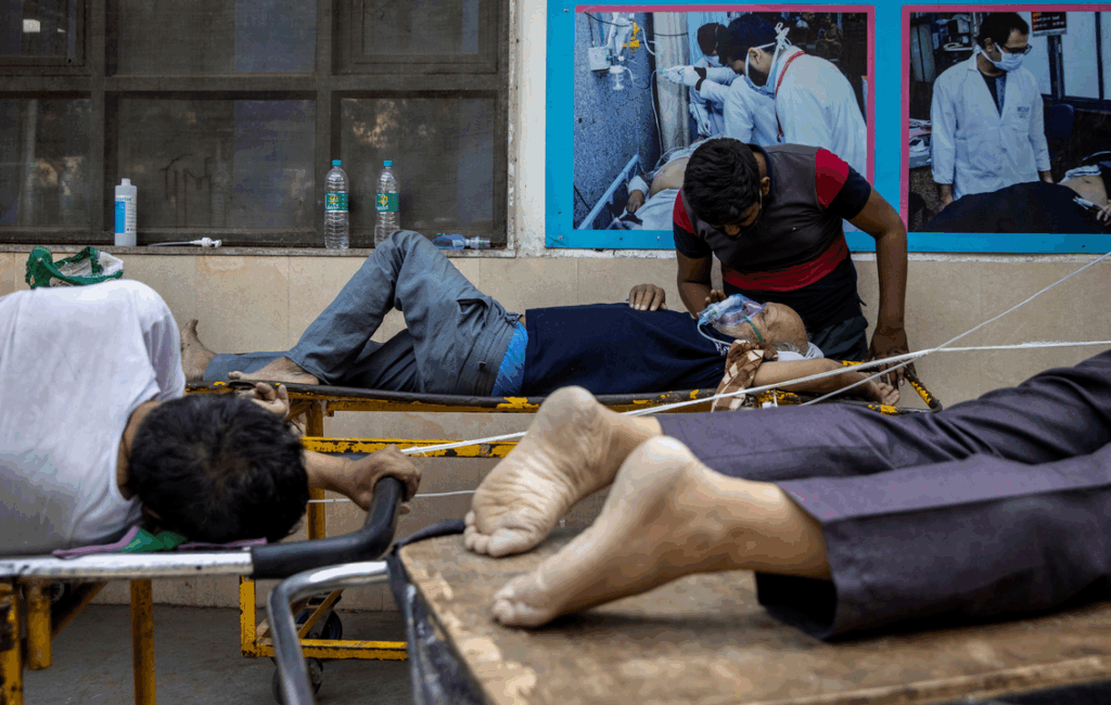 Một người dân Ấn Độ theo dõi nhịp thở của người thân đang nằm ngoài trời, chờ được nhập viện ở New Delhi – Ảnh: REUTERS